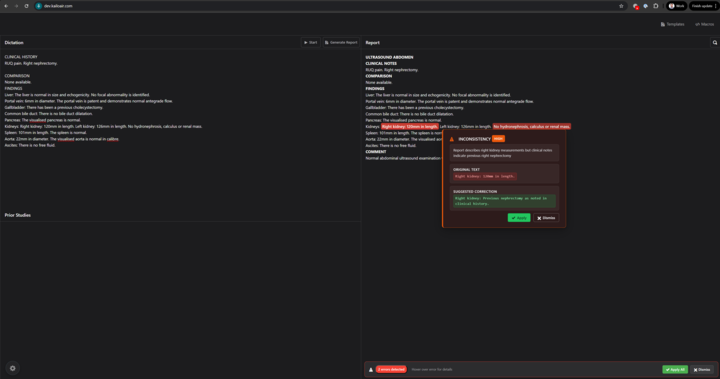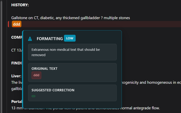 Built-in AI checks flag common errors such as mismatched laterality, missing findings, or incomplete sections before a report is finalized. This helps reduce addenda and ensures accurate, high-quality reporting.